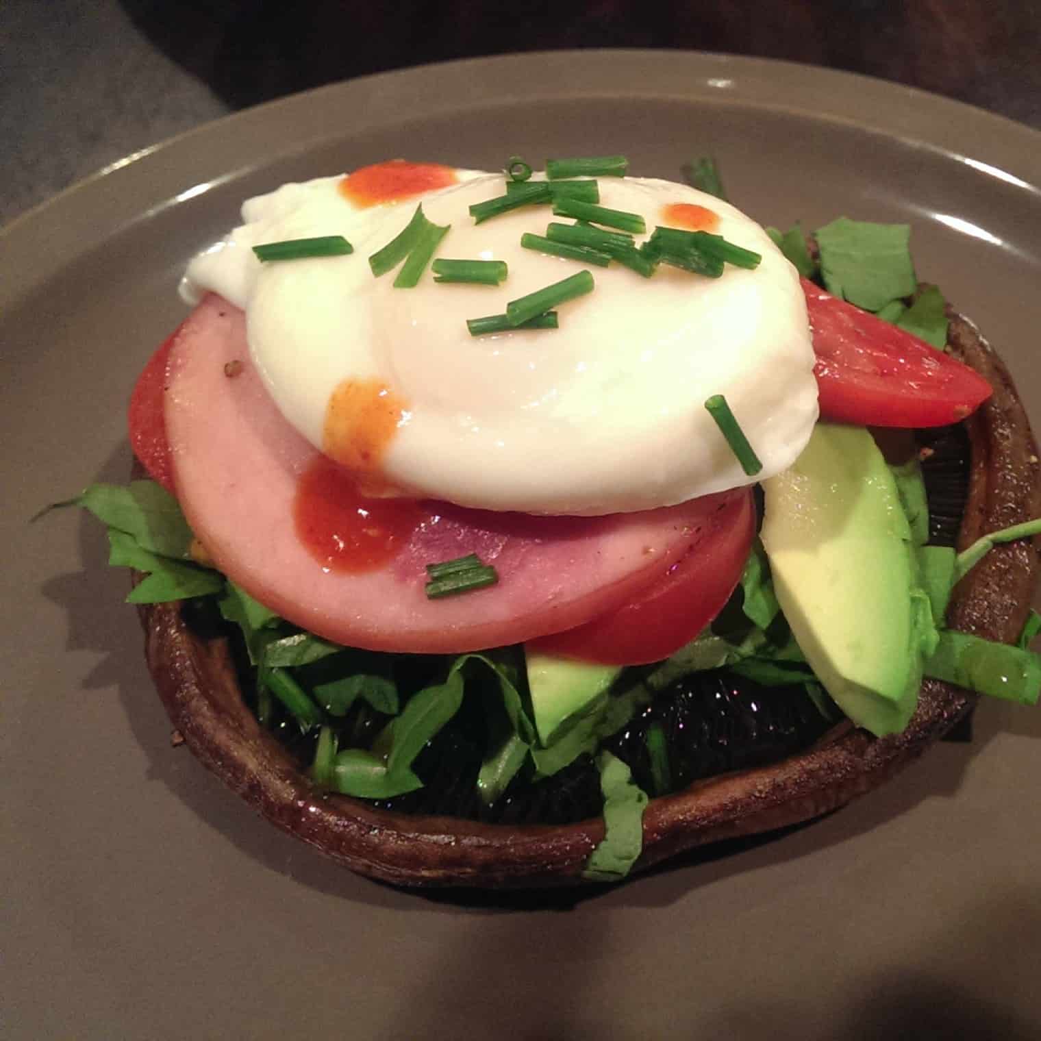 Poached Egg with Portobello Mushroom: Poach 1 egg. Sauté mushroom with a little balsamic vinegar. Layer arugula, avocado, ham and tomato on top of mushroom. Add poached egg on top. Garnish with Chives and Hot Sauce.