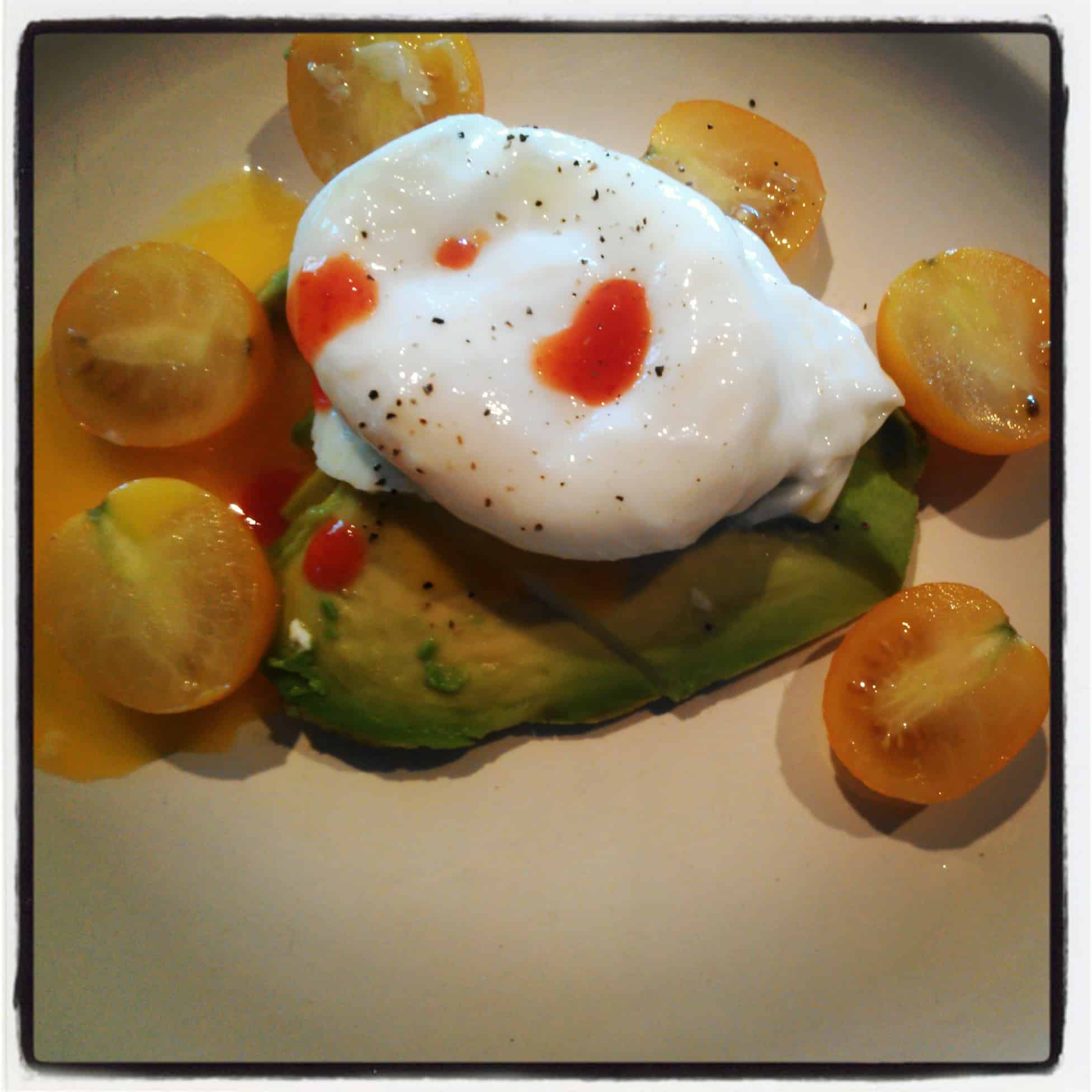 Poached Egg with Avocado and Tomatoes: Poach 1 egg. Place egg on top of sliced avocado and cherry tomatoes (halved). Garnish with salt, pepper and hot sauce.